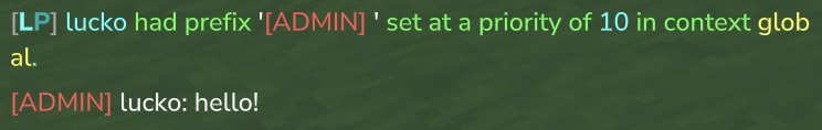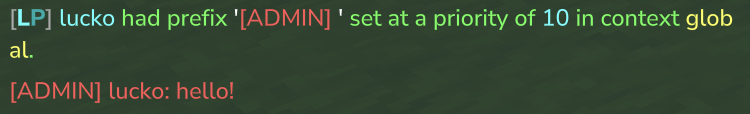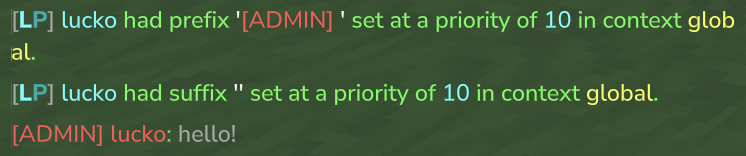 /lp user lucko meta setprefix 10 "<red>[ADMIN] "/lp user lucko meta setsuffix 10 "<gray>" | ![]() |