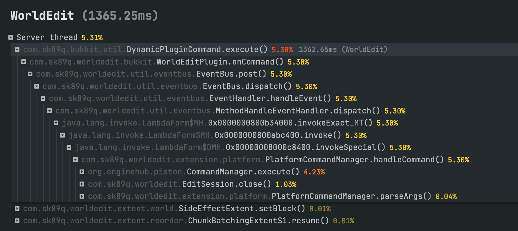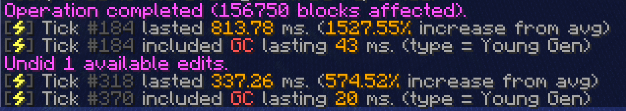 如你所见,WorldEdit 在本次操作中的滴答耗时甚至超过了 1000%!